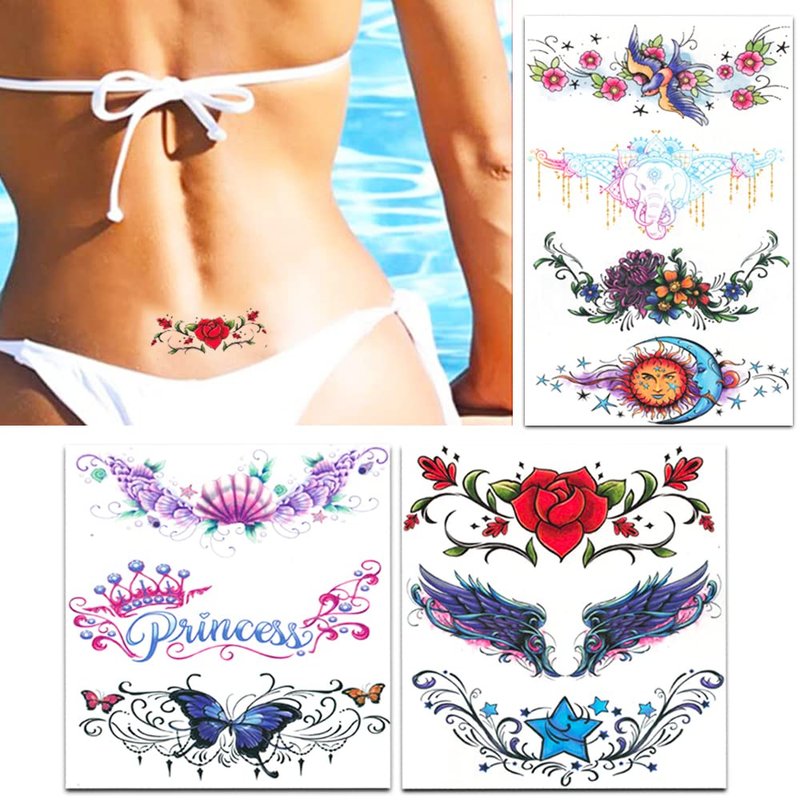 - This set of lower back and navel temporary tattoos has lovely designs including butterfly tattoos, rose tattoos and more!