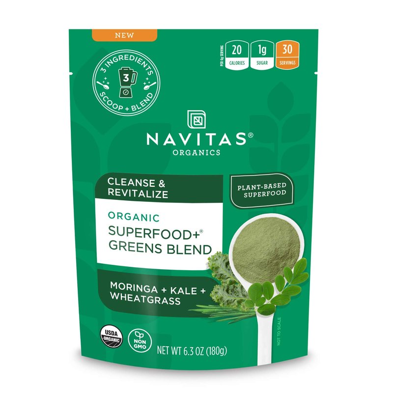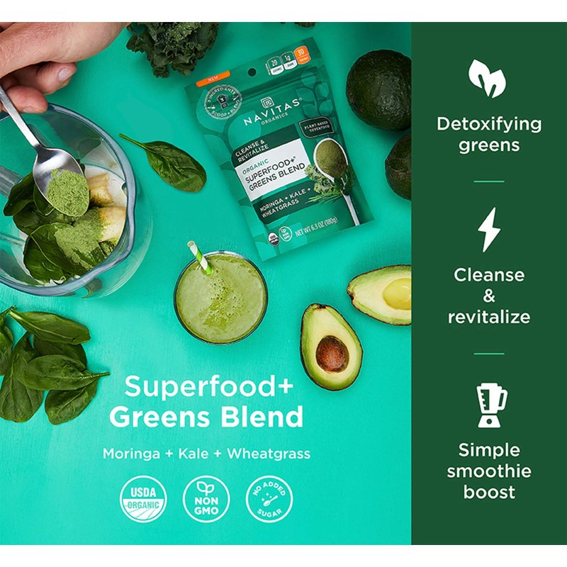 - Navitas Organics Superfood+ Greens Blend is a convenient smoothie boost featuring three of nature’s most powerful greens to help you easily cleanse and revitalize your body.