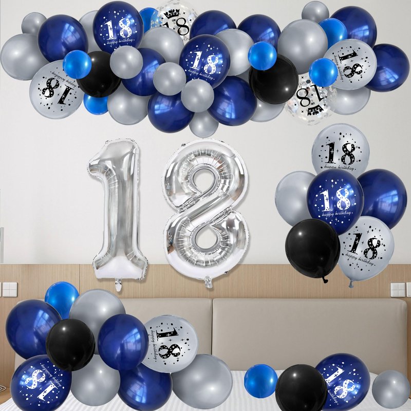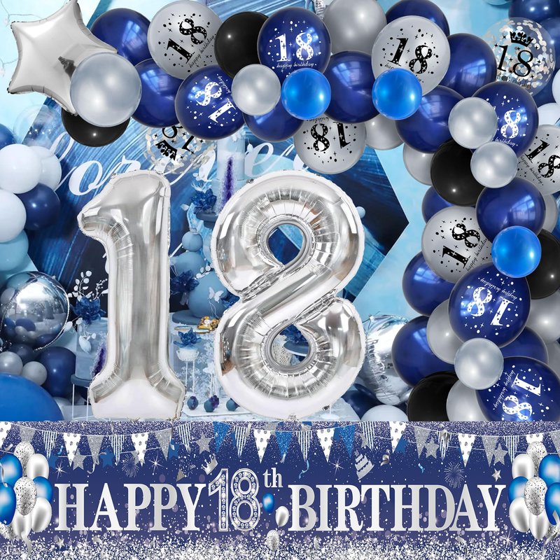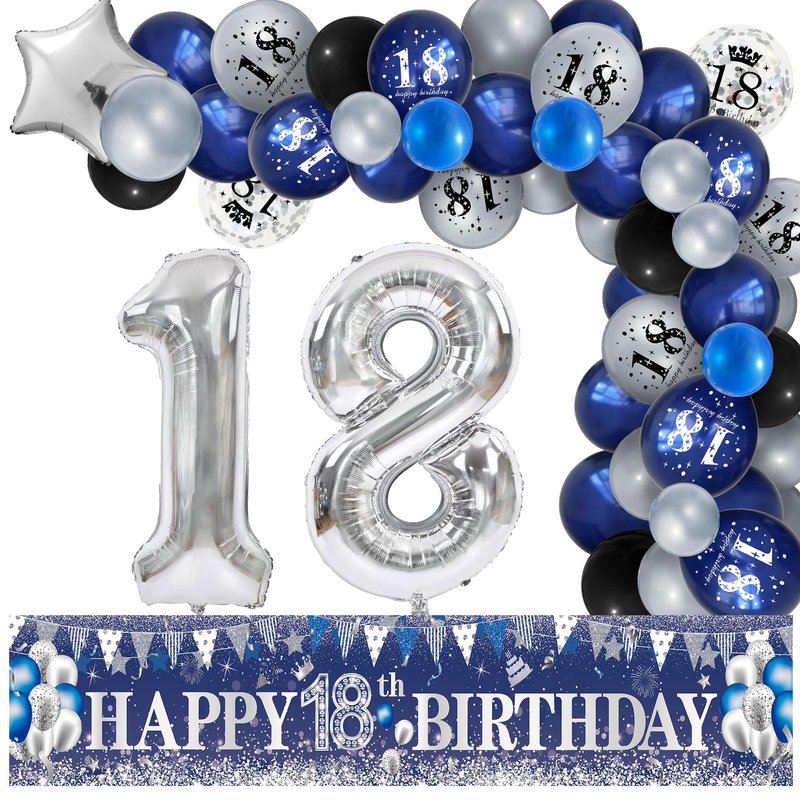 • 66pcs 18th Birthday Yard Decor: This package includes 1pcs blue and silver Happy 18th birthday banner, 10pcs latex birthday balloons with text ''18th'', 29pcs 12inch latex balloons, 2pcs confetti balloons, 20pcs 5inch latex balloons, 2pcs 32inch number balloon, 1pcs 18inch silver star, 1pcs 10m ribbons and 1pcs 5m balloon chain.