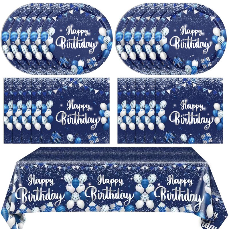Navy Blue and Sliver Birthday Decorations Happy Birthday Party Tableware Set Happy Birthday Tablecloths and Plates Napkins Party Dinnerware for Men Women Kids Birthday Party Supplies