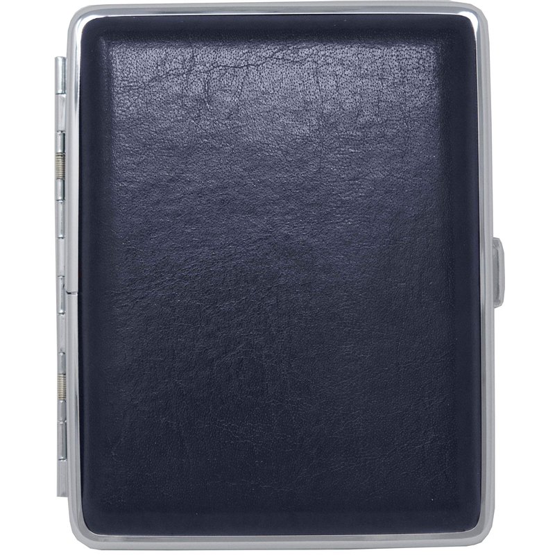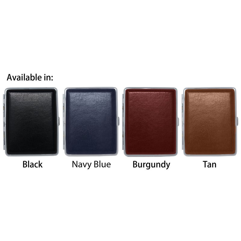 - Covered in genuine smooth leather, this metallic cigarette case is sturdy, corrosion resistant and will last you for years to come. Measuring 4.5" X 3.5", this case can accommodate a full pack: 20 100s or Regular size cigarettes. Available in Black, Navy Blue, Brown and Burgundy colors and in lizard and crocodile leather prints.