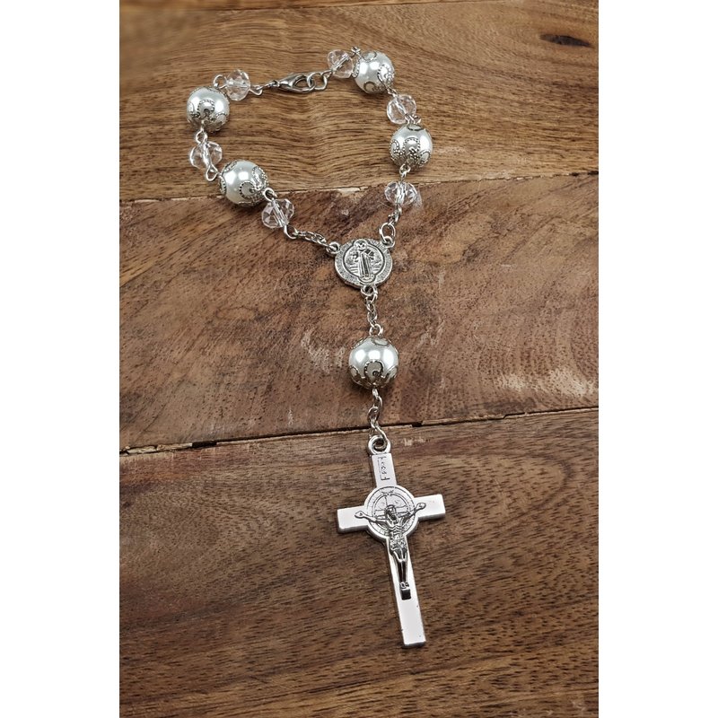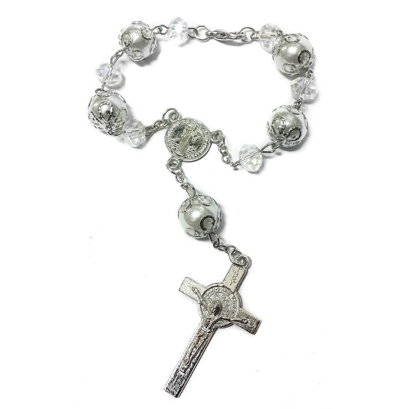 Nazareth Store Saint Benedict Evil Protection Medal White Clear Crystal Beads Rosary Car Auto Mirror Rearview