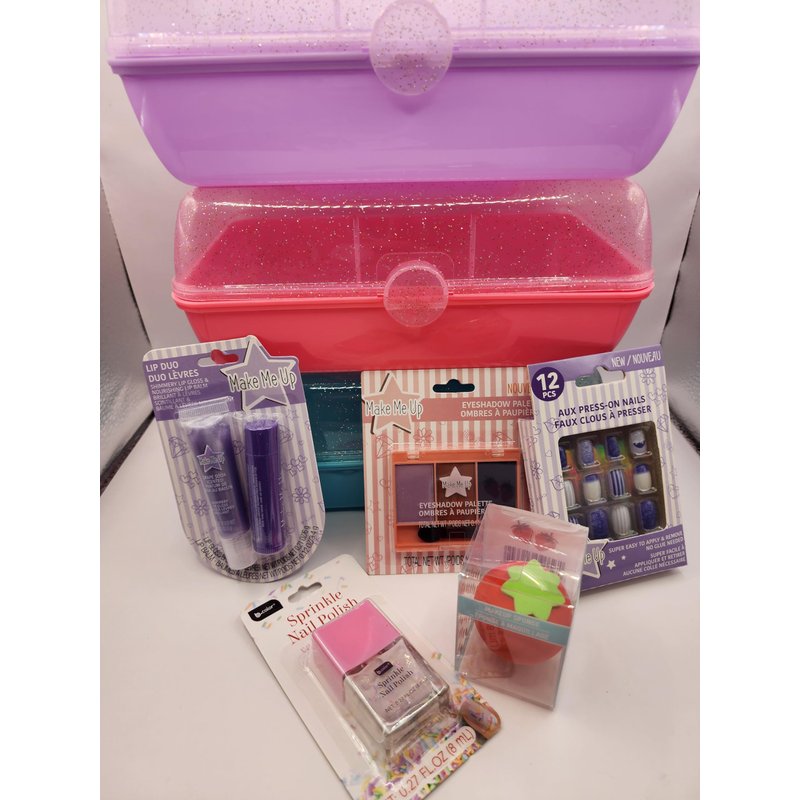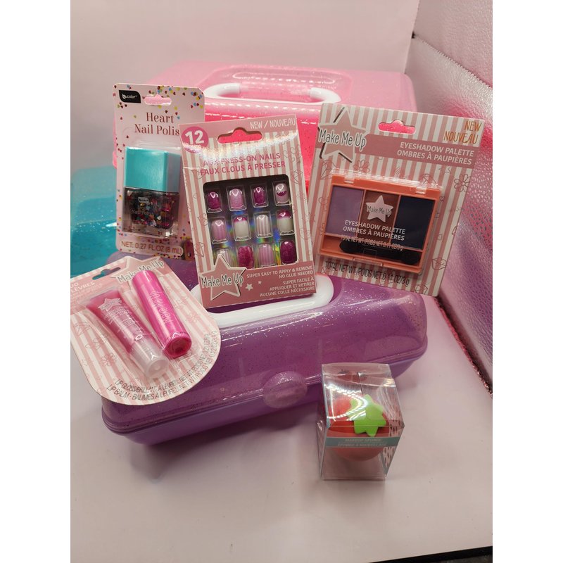 - This makeup case will make your young lady excited. She will get 5 items which VARY. Lip gloss, Fake nails, Sparkly nail polish, Eye shadow, and Beauty blender.