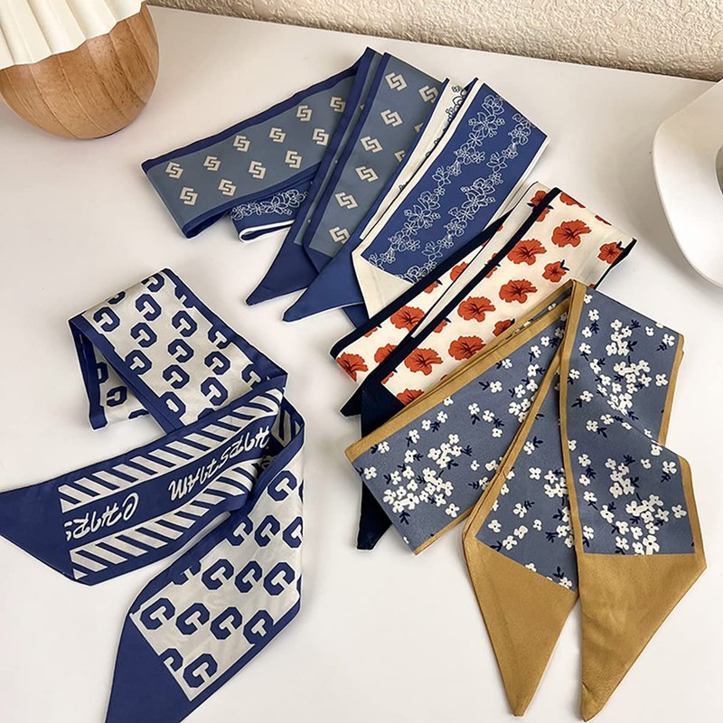 NCDUANSAN Retro small silk scarf girl heart spring and summer narrow ribbon headband headband bag decoration long scarf headdress (blue hair band 5pcs)