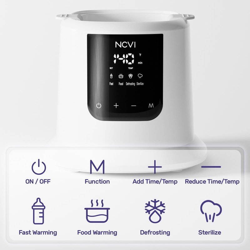 NCVI Baby Bottle Warmer is made of food-grade material and BPA freee. The milk warmer is heated by a water bath, which is fast heating but safer than microwave heating.After the heating is over, it will auto shut down, so that the mother does not have to be in a hurry, while preventing the loss of breast milk nutrition and providing more nutrition for the baby.Anti-dry-burn design keeps busy moms and babies out of harm's way! The lid opening on the top design makes bottle warmer fits a variety of bottles. The milk heater includes a basket with a handle for easy access to the bottle without worrying about getting burned. Fast /Food /Defrosting/Sterilize,multi functions in one bottle warmer which can meet all breastfeeding needs.A portable bottle warmer for travel with small size and light weight.Perfect for feed baby at home or on the go!