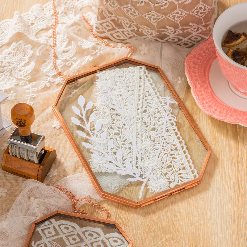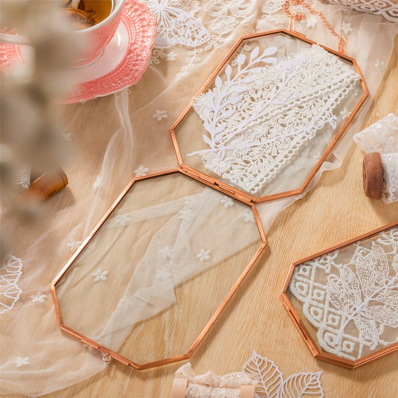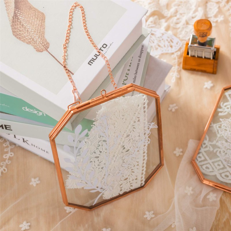 - Handmade long octagon double glass copper and glass frame with a natural vintage rose gold color, go well with pressed flowers and plants.
