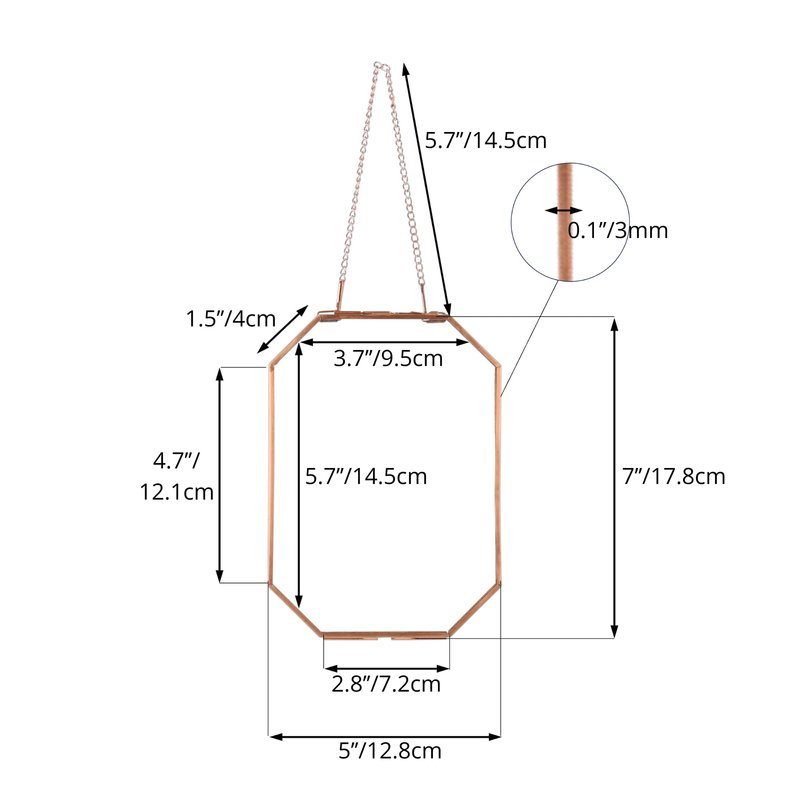 1. Handmade long octagon double glass pure copper and glass frame with a natural vintage rose gold color, go well with pressed flowers and plants. 2. Best wall decor, it can showcase your photos, images, poster on 2 pieces of glass in a floating way. 3. It is an ideal DIY herbarium frame, suitable for pressed flowers, dried plants, botanical wall decor, photo collage, poster, signature. 4. Great gift for birthday gift, for mom / dad grandpa / baby, or for display special moment, like wedding, graduation, family gathering. 5. Material: pure copper, glass. 6.Suitable for thickness up to 3mm. What is in the package: frame, chain, small transparent silicone pads for keeping post / prints in place. Plants are not included. 7. Size: 5x7 inches / 12.8x17.8 cm.