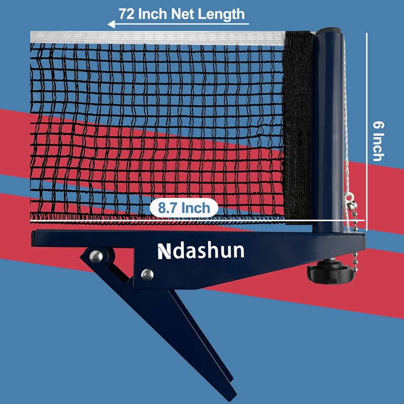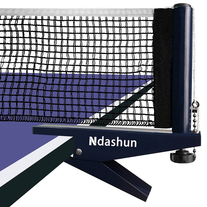 Ndashun professional grade table tennis net and post set gives tournament-level performance for recreational players, this sturdy spring clamp is easily to take on or off from regulation size table, and is suitable for most standard sized table tennis tables. Use the screw to adjust net height and through the ball and chain at both ends of the net to set precision for net tension, this double woven cotton blend mesh stretches to offer optimal tautness. Comes with anti-slip rubber padding within post, protects your table from scratches, and heavy duty metal wide base makes clip to grip table surface tightly. Enjoy this portable ping pong net and post kit today, is ideal for men, women, kids, all ages and skill sets