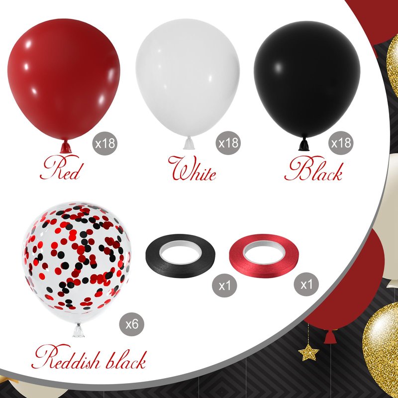- Red black and white confetti balloons set: This balloon kit includes 18 red balloons, 18 black balloons, 18 white balloons, 6 confetti balloons, and match 2 rolls of ribbons red and black