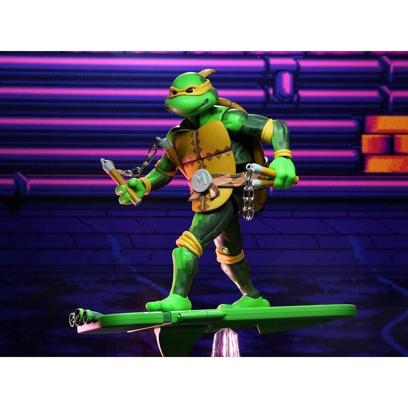 - Michelangelo comes with signature weapon and hoverboard with display stand that can be used for even more poses