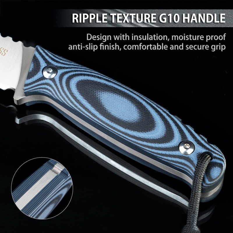 - EXQUISITE RIPPLE TEXTURE G10 HANDLE - An epoxy filled woven glass fiber that is rigid, impervious to temperature changes and chemicals. G10 is insulation, good abrasion resistance, moisture proof, anti-slip.