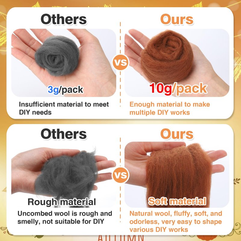 - 【Fall-style Wool】We offer you 10 packs of wool roving with a strong fall atmosphere in 10 beautiful earth tones such as orange and brown, perfect for fall, Thanksgiving, and Halloween-themed crafts. With the rich colors and enough quantity, you can DIY many lovely felt crafts without any worries.