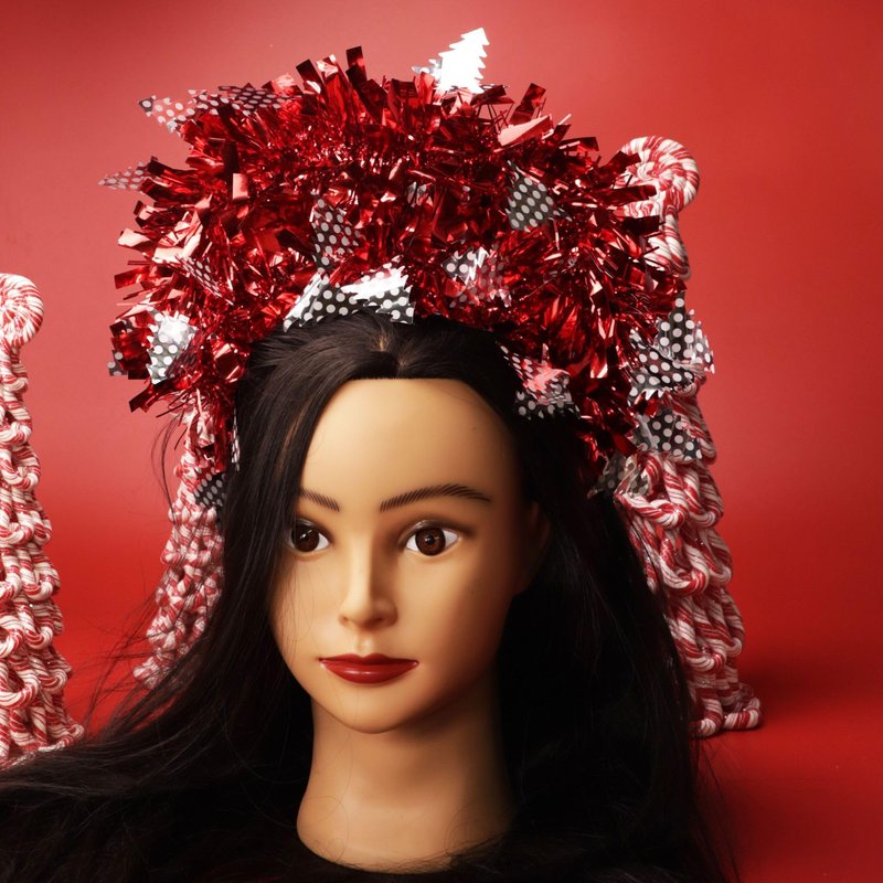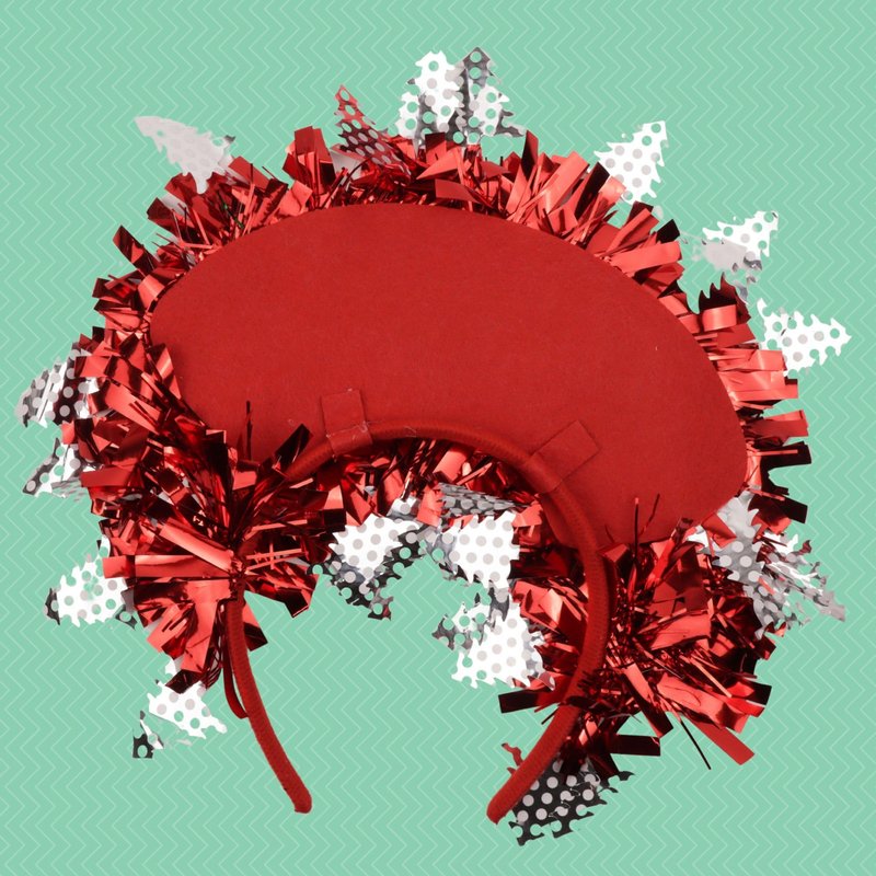 - Intended for ages 15 and up, this headband features red tinsel and silver toned polka dotted Christmas Tree accents
