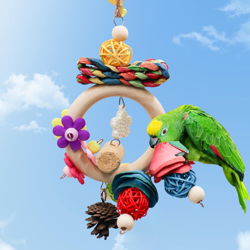 - Colorful and Decorative: The combination of the natural wood color and various colorful chewing materials creates a visually appealing and harmonious toy. Not only does it serve as an engaging chewing toy, but it also acts as a beautiful decoration for your birdcage, enhancing its overall aesthetic.