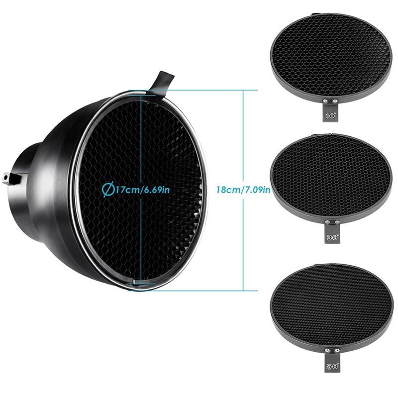 - 7"/18cm standard reflector with 10/30/50 degree honeycomb grid for bowens mount studio light strobe.