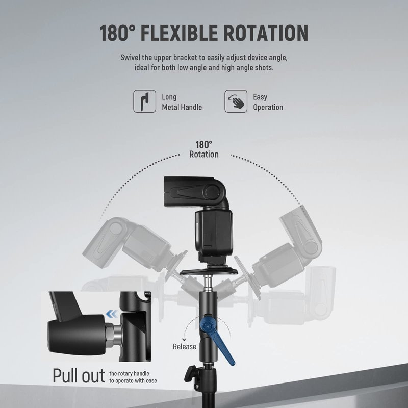 - 【Flexible & Multiple Angle Positioning 】 With two parts attached by an adjustable bolt, the top bracket can swivel at 180° to position your flash or other filming devices at different angles for both low angle shots and high angle shots. Long metal handle for easy operation and adjustment.