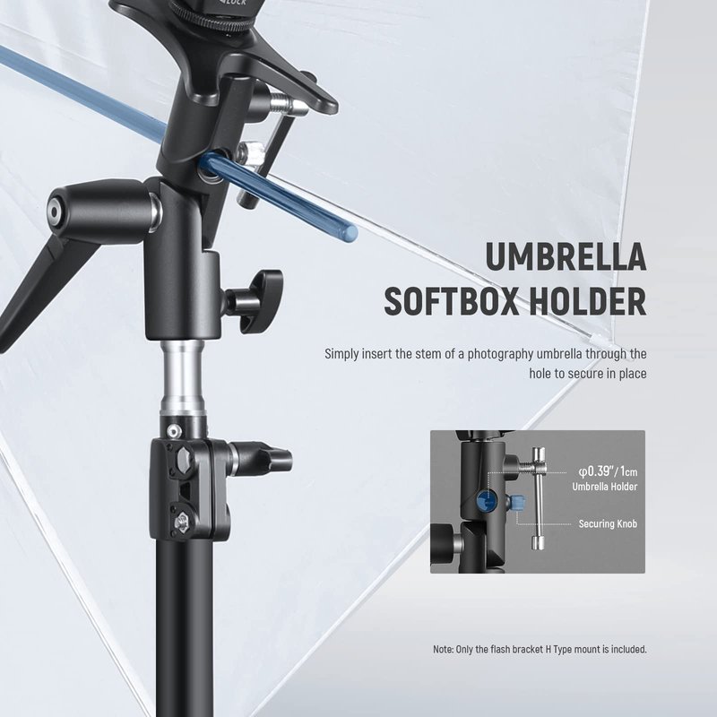 - 【0.39"/1cm Soft Umbrella Holder】 Easily insert an umbrella through the designated hole and secure on the bracket. Use an umbrella together with a speedlite flash to soften and spread the flash light. Angle adjustable as well