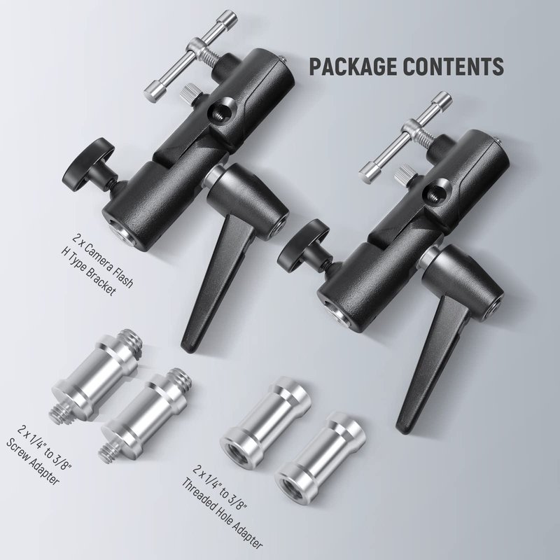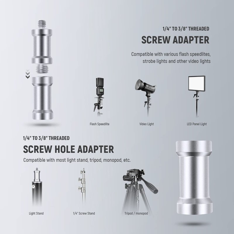 The top 1/4"-3/8" double-threaded screw adapter makes it a wide fit for most speedlite flashes, LED light panel, softbox, studio light, and other mountable photography equipment with 1/4” or 3/8” screw.