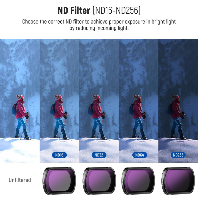 - 【Balanced Exposure for Superior Outdoor Shots】 The ND16, ND32, ND64 and ND256 action camera filters, featuring light reduction by 4, 5, 6, and 8 stops, provide precise exposure control during dynamic outdoor activities. They effectively prevent overexposure and elevate image quality across a range of sunlight conditions