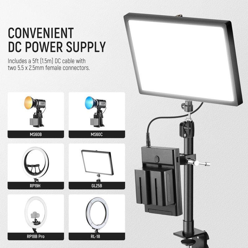- 【Convenient DC Power Supply】 Also includes a 5ft (1.5m) DC cable with two 5.5x2.5mm female connectors. It helps you connect the battery plate to a studio LED video light for power supply and allows you to move the light everywhere, compatible with Aputure AL-M9 compatible with Godox SL-60W compatible with ZHIYUN Molus G60 60W Pocket COB Light, and NEEWER 18 inch ring light MS60B MS60C 660 RGB660 and more