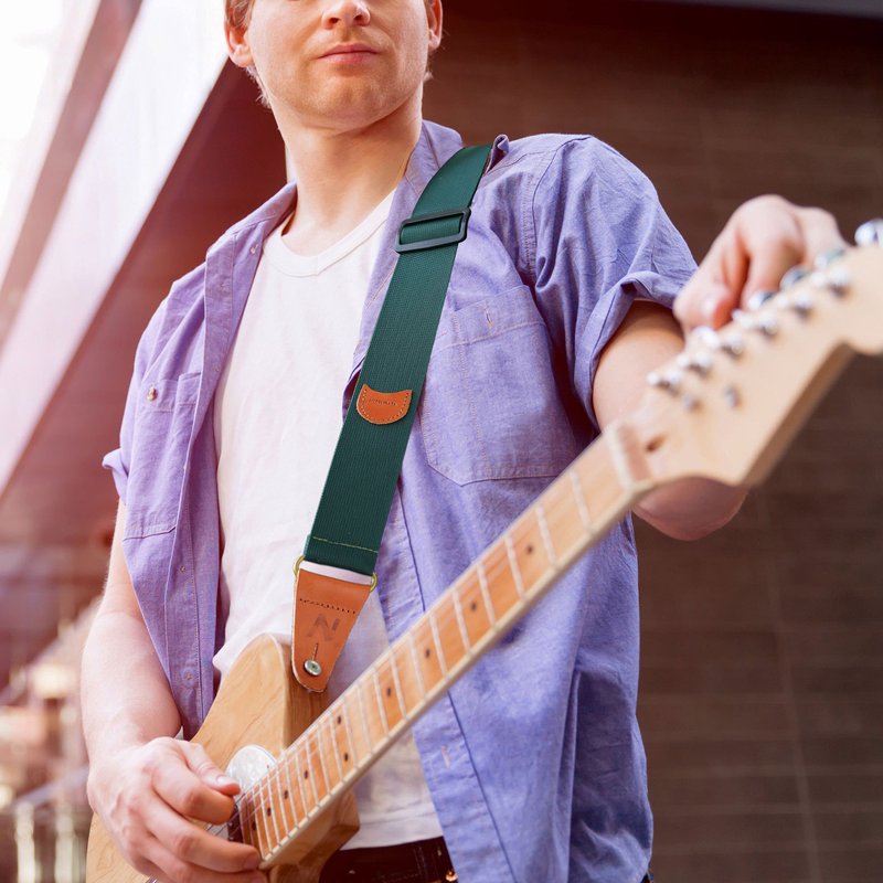 Nefelibata Guitar Strap, Nylon Full Grain Leather Ends Guitar Straps with Pick Pocket for Bass, Electric & Acoustic Guitar, Come with Free Strap Button, 1 Pair Strap Locks and 4 Guitar Picks(Green)