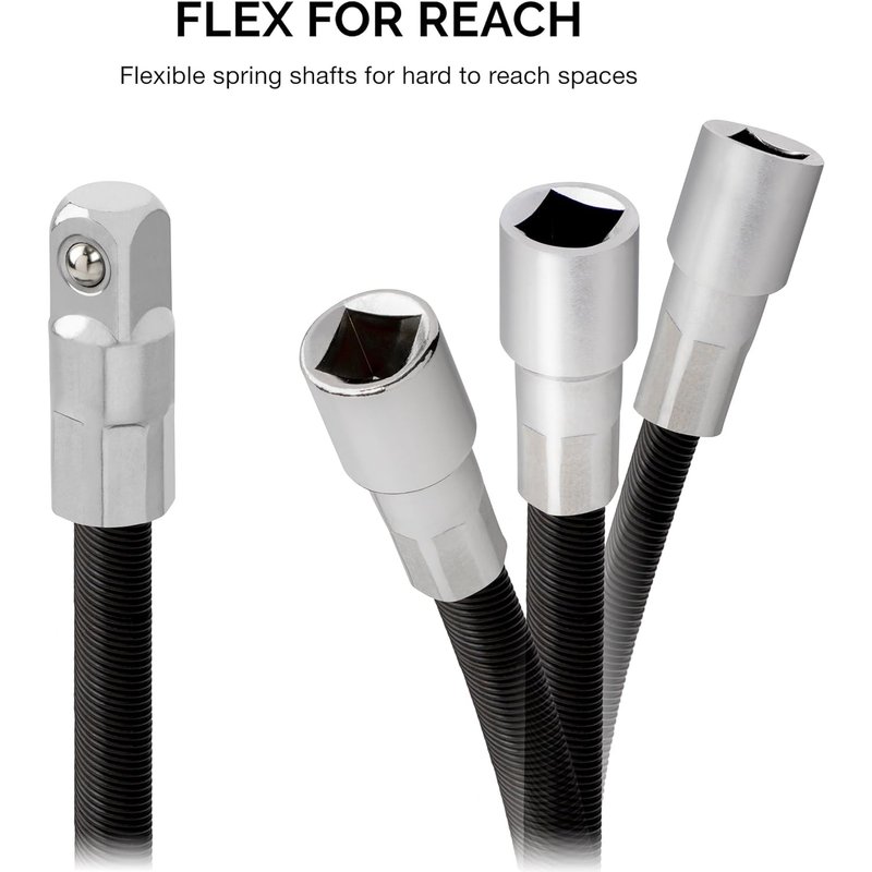 - FLEXIBLE EXTENSION BARS: Both bars in this ratchet extension set maintain excellent rotational torque transfer from ratchet to socket, and the heavy-duty steel wound springs provide total flexibility up to 45°.