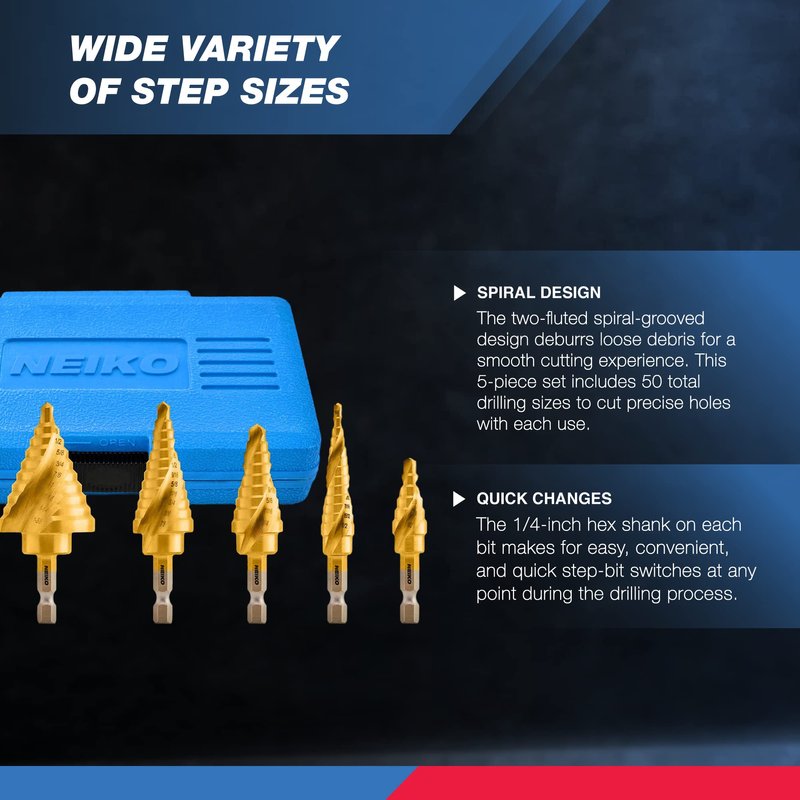 NEIKO 10173A Step Drill Bit Set for Metal and Wood, 5 Piece SAE, Spiral Grooved for Faster Drilling, Step Bits with 50 Total Step Sizes, Titanium Coated Unibits