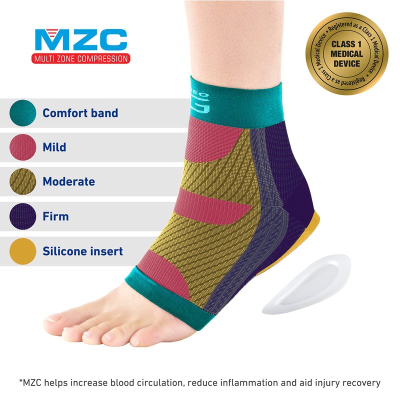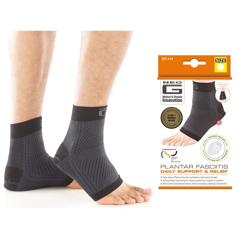 The Neo G Plantar Fasciitis Everyday Support features Multi Zone Compression to help relieve swelling and discomfort. Advanced Silicone Heel Cushioning helps provide impact protection as well as support and added comfort in every step. The support is used to help relieve Plantar Fasciitis symptoms such as heel and arch pain. Slimline and lightweight design enables the support to be worn in most footwear, making it the perfect solution for daily activities and everyday relief. The integrated anatomic silicone insert provides pressure release and advanced cushioning enabling best support and relief. Helps protect and support heel and foot during everyday, recreational and sporting activities. Can be worn all day, with or without footwear helping you stay active.
