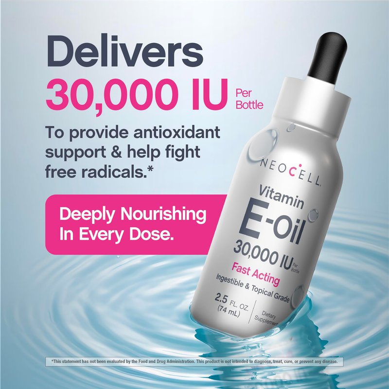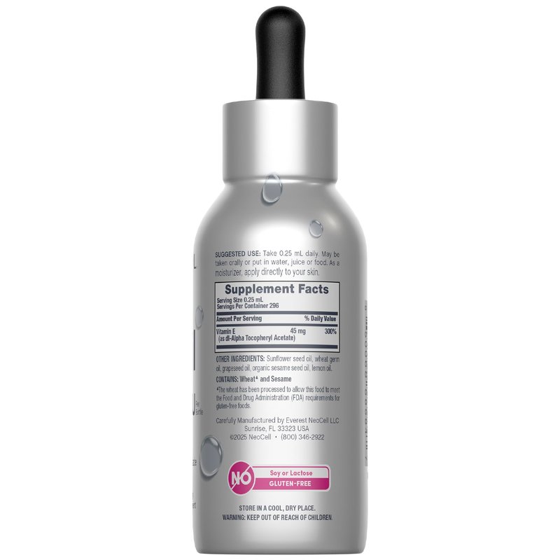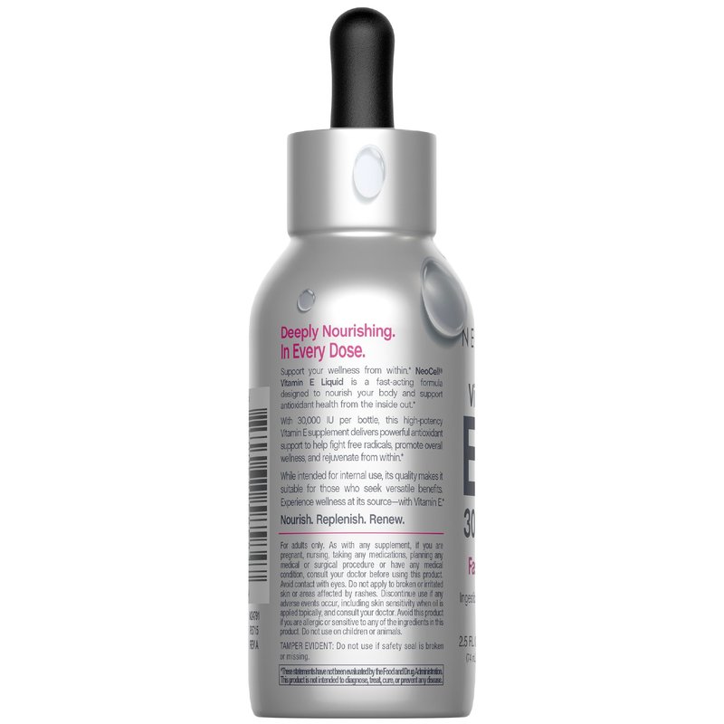 Nourish, Replenish & Renew with Vitamin E* Vitamin E is an essential nutrient and a widely known antioxidant. It has been appreciated for its versatility for decades. Found in a variety of foods like nuts, seeds, and plant oils, it is also a primary ingredient in skin care products, often found in moisturizers or serums. Ingestible & Topical Grade Liquid This versatile liquid formula is both ingestible and topical grade. It can be taken orally, alone or mixed with water, juice, or food. While intended for internal use, its quality makes it suitable for those who seek versatile benefits and can also be applied directly to the skin as a moisturizer. NeoCell For nearly 30 years, NeoCell has been a trusted leader in unlocking the transformative benefits of collagen and essential nutrients. Trusted by millions, our products are designed to illuminate your inner beauty in a way that stands the test of time.* *These statements have not been evaluated by the Food and Drug Administration. This product is not intended to diagnose, treat, cure, or prevent any disease.