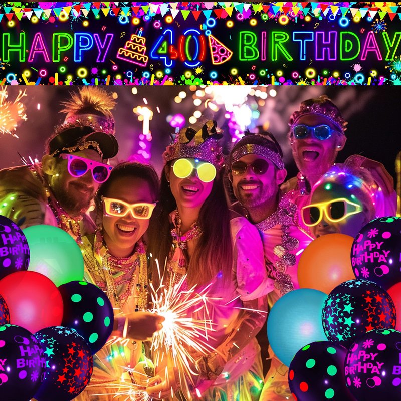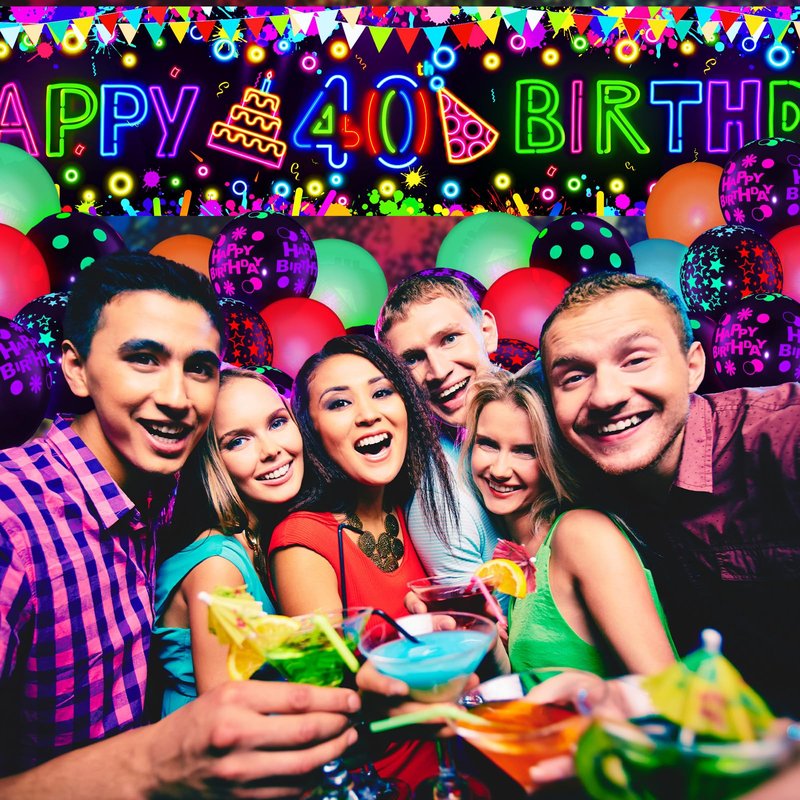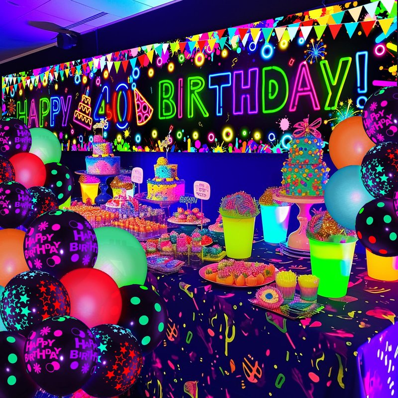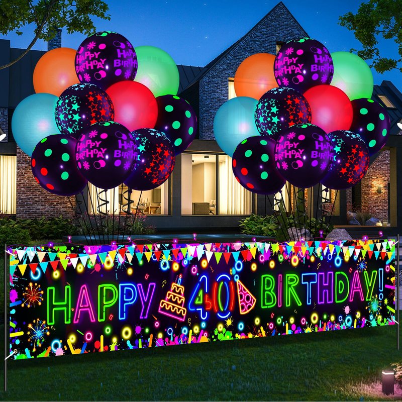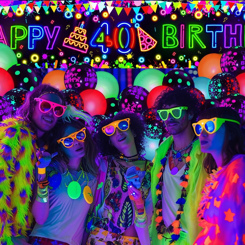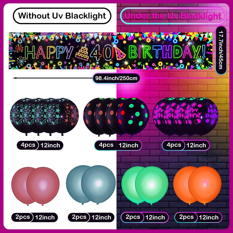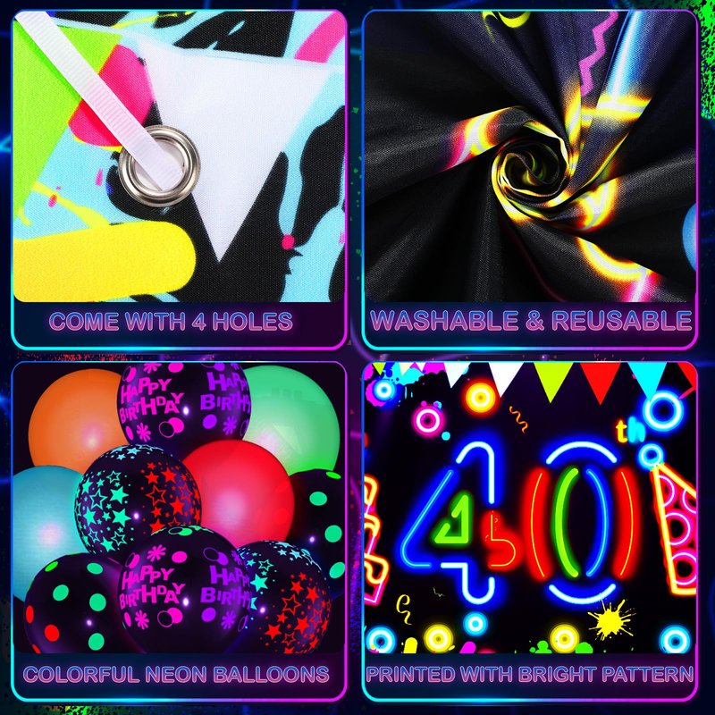 - ✨Neon Birthday Party Decorations: These neon 40th birthday banner and neon party balloons are designed with fun colorful neon birthday elements: graffiti, fireworks, flags, birthday cake, light stick, light circle and glow "Happy 40th Birthday " letters, under UV light, these glow party banner balloons will be highlight of your party and impress your guests