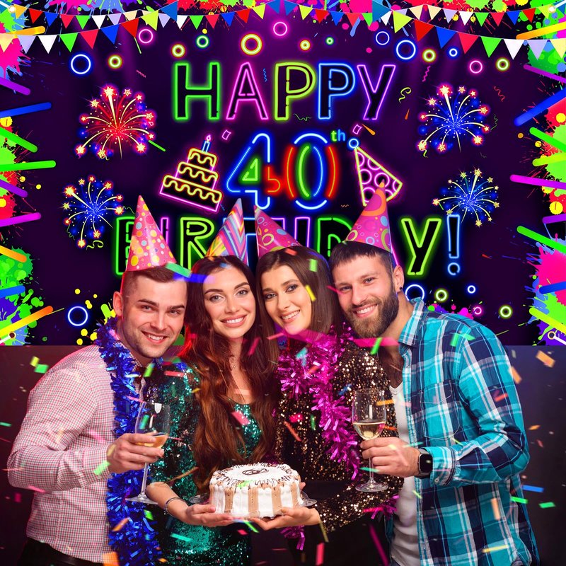- ✨【Neon Birthday Party Decorations】The neon 40th birthday banner is designed with fun colorful neon birthday elements: graffiti, fireworks, flags, birthday cake, light stick, light circle and glow "Happy 40 Birthday Banner" letters, under UV light, the glow party banner will be highlight of your party and impress your guests