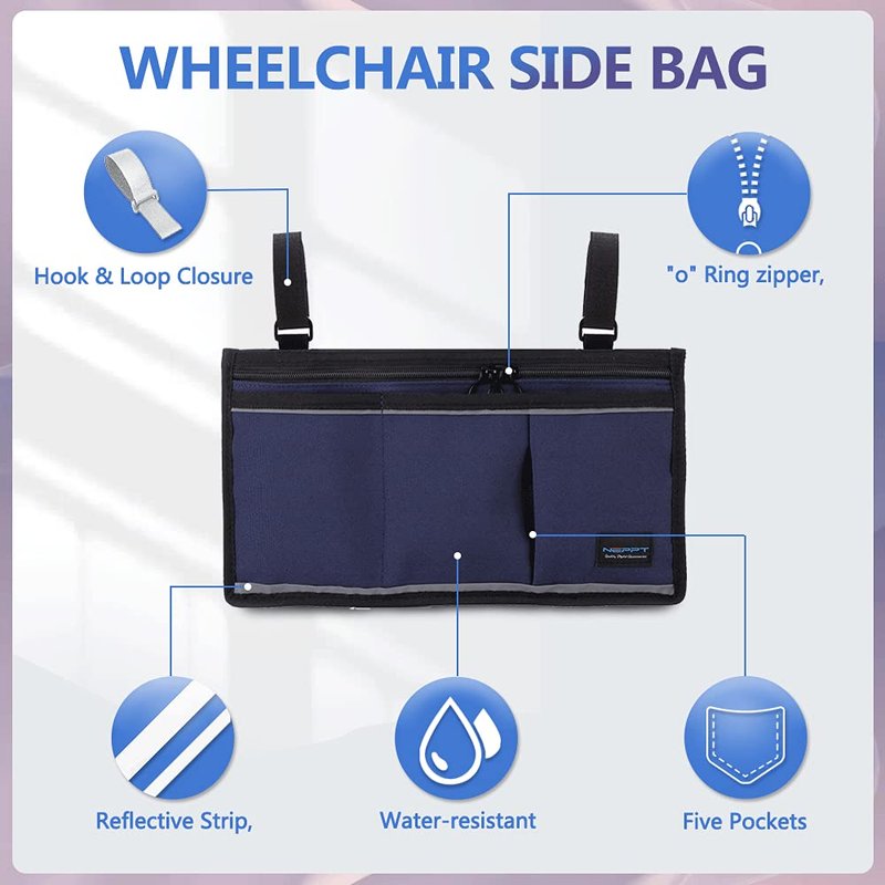 NEPPT Wheelchair Bag Walker Pouch for folding walker Electric Wheelchair Side Bag Scooter Power Chair Accessories Mesh Storage Organizer with Phone Holder for The Armrest Travel Saddle Bag (Dark Blue)