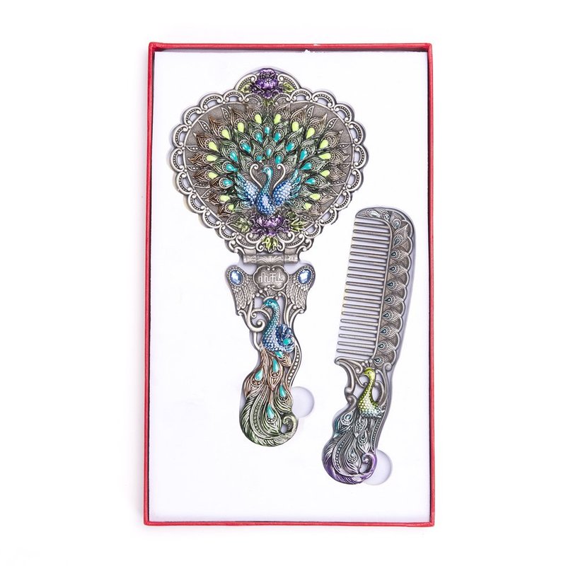 - ITEM SPECIFICS -- Vintage style mirror comb set, includes one hand mirror and one comb. Heart-shaped mirror, sophisticated peacock pattern, foldabale. Superb craftsmanship, a great match to your cosmetics set. The mirror stands on surfaces while folded. Handle size and touch is just nice for gripping. Easy to adjust the angle while folding it