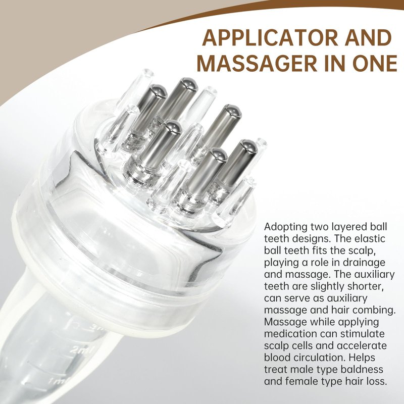 - 【Applicator and Massager in One】 Adopting two layered ball teeth designs. The elastic ball teeth fits the scalp, playing a role in drainage and massage. The auxiliary teeth are slightly shorter, can serve as auxiliary massage and hair combing. Massage while applying medication can stimulate scalp cells and accelerate blood circulation. Helps treat male type baldness and female type hair loss.