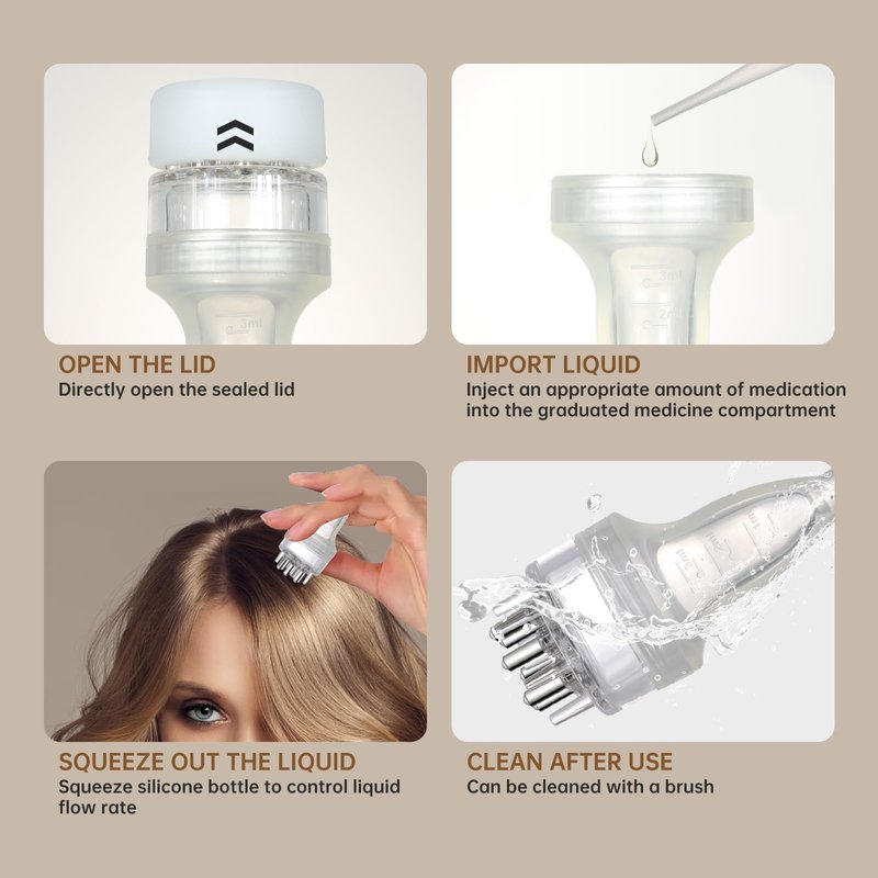 - 【Easy to Use 】 After adding liquid, make the ball teeth fit against the scalp and slide back and forth. The medicine will naturally and slowly flow out. If you want to accelerate the liquid outflow rate, simply apply slight pressure on the soft silicone cover with your thumb to double the liquid output.