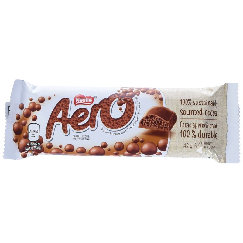 Milk Chocolate. Smooth chocolate on the outside with the classic Aero bubbly chocolate texture inside. A classic chocolate bar filled with bubbles of air. Delicious chocolate with various robust chocolate flavors. Smooth chocolate on the outside with the classic Aero bubbly chocolate texture inside. Imported from Canada