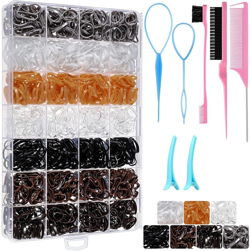 - 【Hair Accessories Gift】The package includes 1500pcs neutral colors elastic hair ties in a clear reusable organizer box, also comes with 2 Tail Hair Tools, 1 Tease Brush, 1 Side Brush, 1 Rat Tail Comb, and 2 Hair Clips. 7 colors are very commonly used, suitable for various occasions.