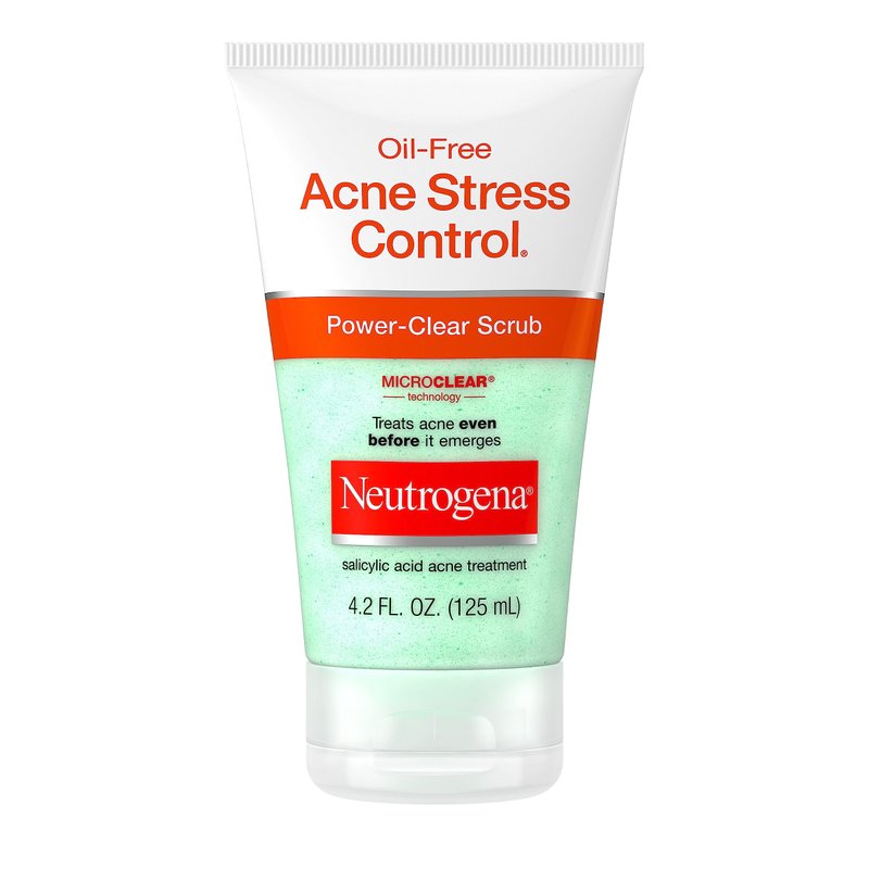 - 4.2-fluid ounce tube of Neutrogena Oil-Free Acne Stress Control Power-Clear Facial Scrub with 2% salicylic acid acne treatment medication gently cleanses and fights breakouts while gentle exfoliators sweep away dirt & oil