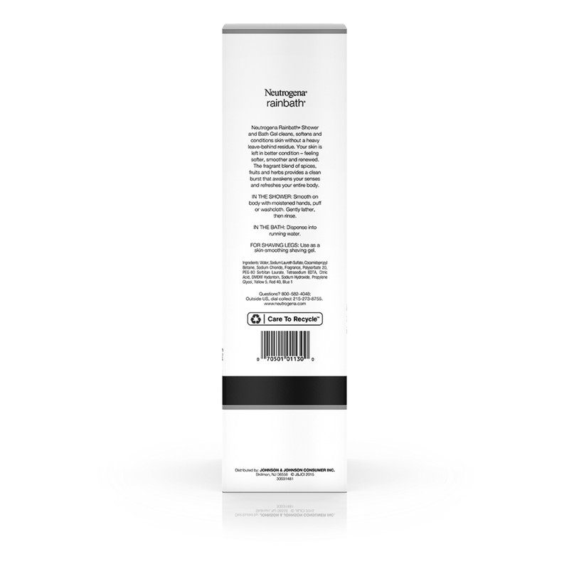 - 32-fluid ounce pump bottle of Neutrogena Rainbath Refreshing Shower and Bath Gel featuring the original refreshing scent of spices, fruits, and herbs
