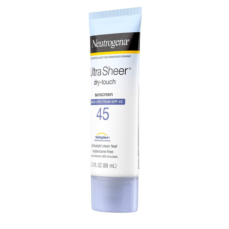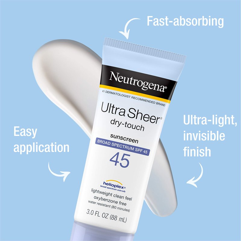 - 3-fluid ounce bottle of Neutrogena Ultra Sheer Dry-Touch Non-Greasy Sunscreen with SPF 45 that helps defend against the signs of sun and decrease the risk of skin cancer caused by the sun when used as directed