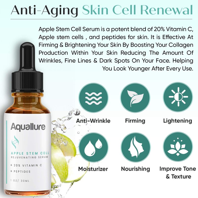 Aquallure Apple Stem Cell Rejuvenating Serum Adult stem cells can decline rapidly as we age. This can usually lead to signs of aging like wrinkles, fine lines, and crows feet. This Aquallure Apple Stem Cell Serum, helps skin to revive skin cells by reducing the appearance of aging, while adding moisture and peptides for an age-defying look. Utilizing the most cutting edge beauty technology and scientific advancements available today, researchers have figured out how to extract the stem cells from a rare variety of Swiss apples and use its youth regenerating properties on human skin! Combined with skin rejuvenating ingredients, the Aquallure Apple Stem Cell serum is a great addition to your beauty regimen. Renewing Ingredient Highlights: ⊳ Swiss Apple Stem Cell Extract | The science of the stem cell is a liposomal extracted Swiss Apple Stem Cell known for its longevity. Formulated to aid in the healing process and helps protect the skin from inflammation and supports the immunity of the skin during the healing process. It increases elasticity, fights, chronologically aging skin cells, helps build new tissue, and thus delays creation of wrinkles.