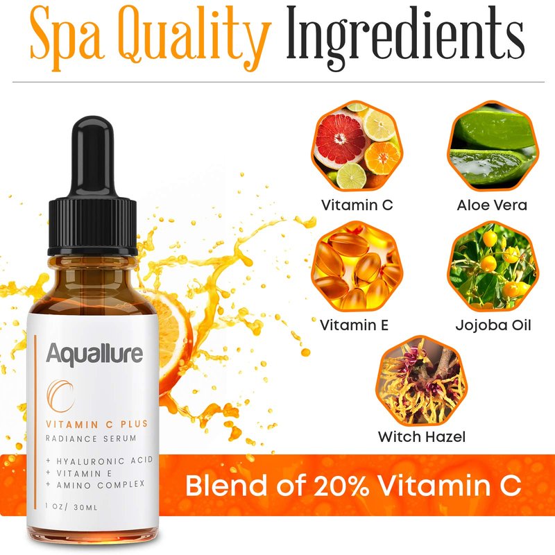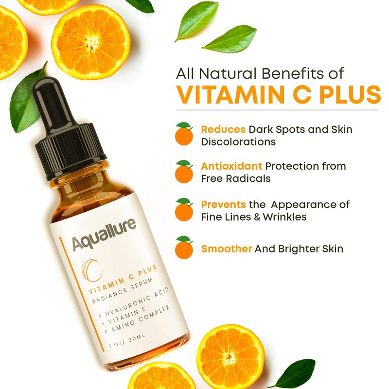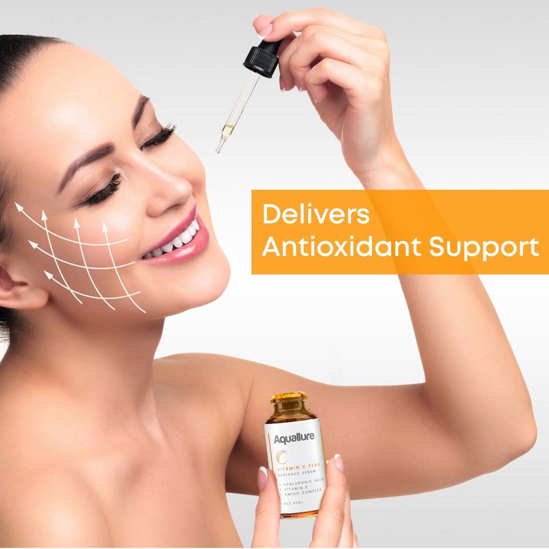 Aquallure Vitamin C Radiance Serum This Aquallure Vitamin C Plus Serum, helps skin to look bright, plump, and hydrated. Vitamin C is one of the premium ingredients to help combat the signs of aging. This formula is loaded with additional benefits for a complete facial serum to help improve tone and texture. The serum absorbs instantly leaving your skin feeling soft and smooth, never greasy. Perfect to use under makeup or on its own. Get radiant-looking skin when you add the Aquallure Vitamin C Plus serum to your daily beauty routine.