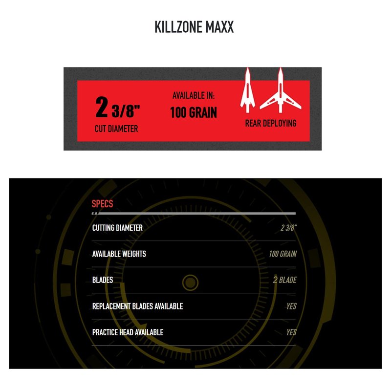 - TOP-QUALITY MECHANICAL BROADHEADS - The Killzone Maxx is NAP's largest cutting diameter mechanical broadhead in the Killzone line; These 2-blade broadheds also feature Killzone's rear-deploying design and patented blade retention technology