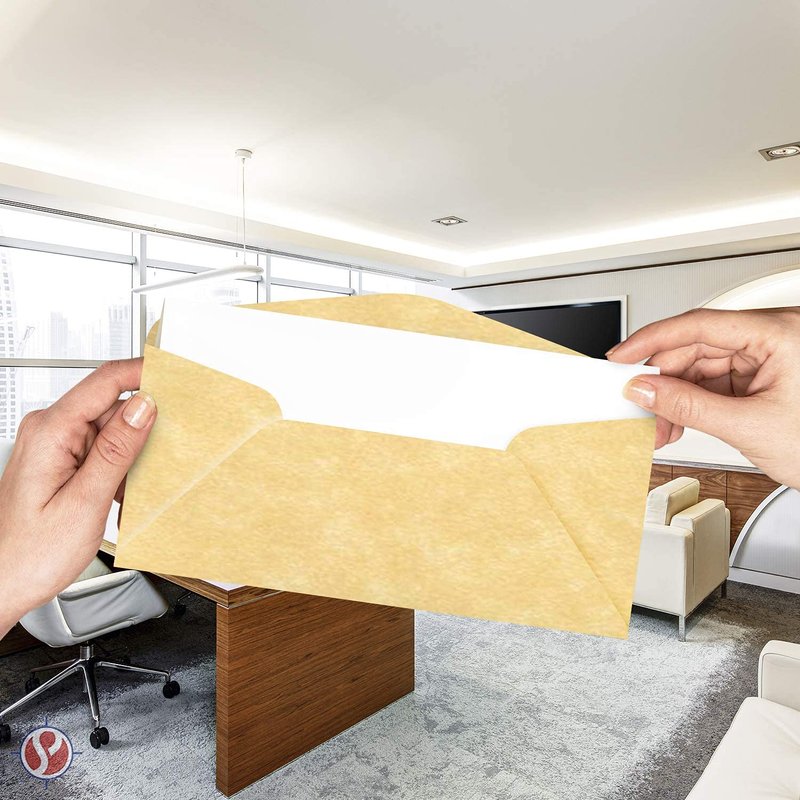 The envelopes are made from premium quality and durable 24lb Bond (60lb Text) Imitation Stationary Paper. Its elegant and classic New Champagne parchment finish covers both the exterior and interior of the envelope. It’s the envelope that your friends and clients will love!