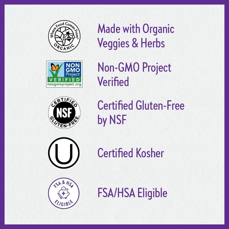 - Made with Certified Organic Vegetables & Herbs, Non-GMO Project Verified, 100% Vegetarian, Certified Kosher, Certified Gluten-Free by NSF, No Synthetic Fillers, No Artificial Flavors or Colors