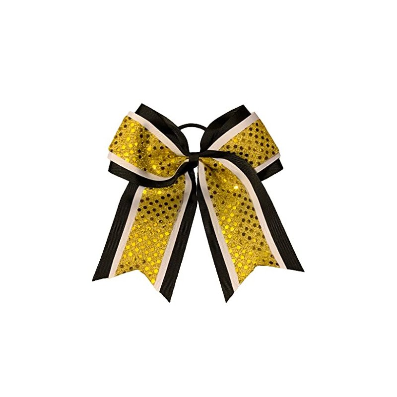 This listing is for a Boutique Grosgrain Ribbon Cheerleading Hairbow! FUNKY & FUN! These are hand-made by me! The Hairbow is made out of black colored premium 3 inch grosgrain ribbon, white grosgrain ribbon, and a sparkly yellow gold confetti dot tulle fabric! These Boutique Bows are approx. 7 inches in length and 7 inches wide. Cheer Bows are attached to a stretchy elastic hair tie! Great for Cheer Practice, Football Games, Pageants, Cheerleading, Gymnastics, Dance, Vacations, Birthdays, 4th of July, Patriotic Events, Easter, and more! Your daughter will love these bows! Check out my store for other hairbow colors & styles!