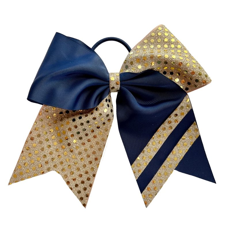 New "CONFETTI STRIPES Navy Blue Gold" Cheer Bow Pony Tail 7 Inch Girls Hair Bows Cheerleading Dance Practice Football Games Competition Birthday Tick Tock Grosgrain Ribbon