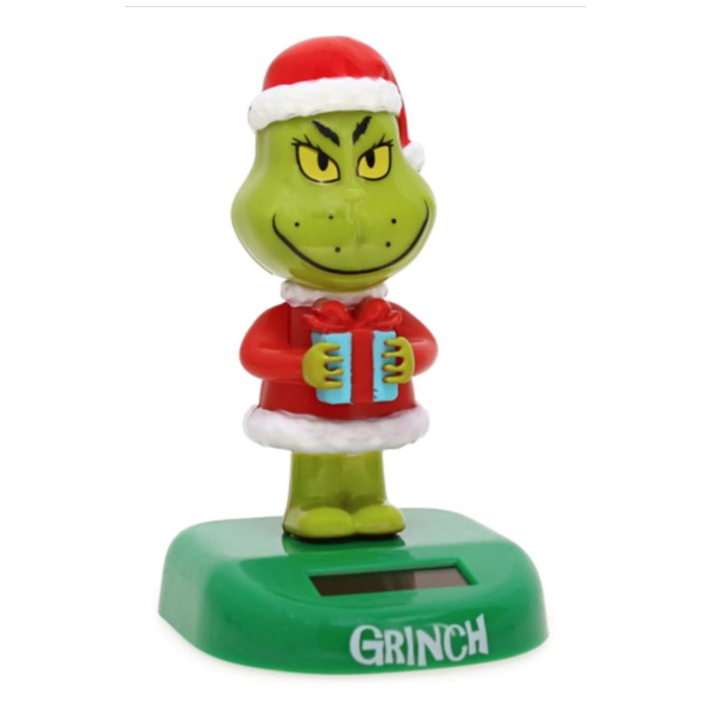 Celebrate a timeless children's classic with this funky statuette that won't stop bobbing! Dr. Seuss The Grinch Solar Bobble Head is a plastic figure with a broad, green base that depicts The Grinch dressed in full Santa Claus garb holding a present. When the solar element is exposed to bright light, The Grinch will bob his head side to side! Set him out on the counter for a fun way to celebrate a Whoville Christmas! Dimensions: Length: 3 5/16" Width: 3 1/8" Height: 5 1/8"