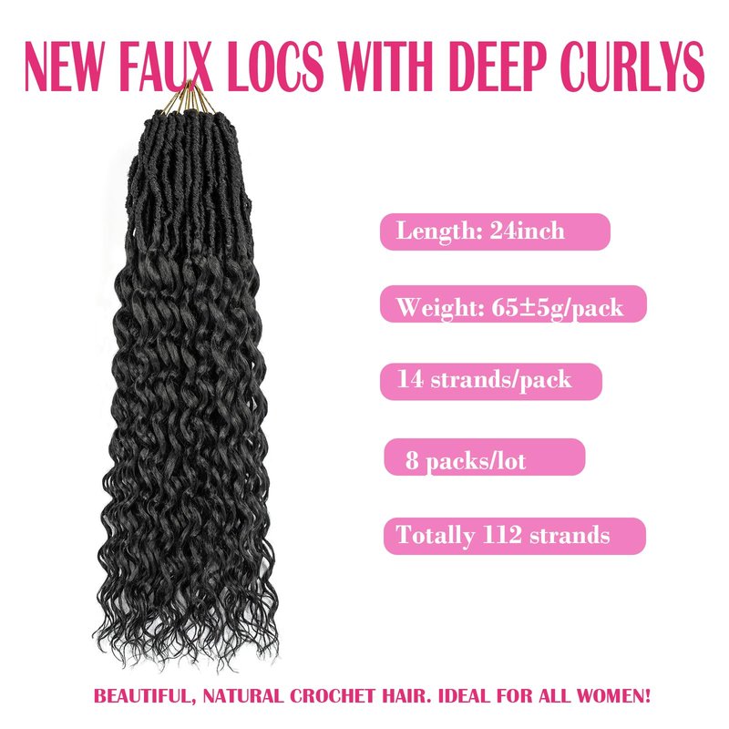 New Faux Locs Crochet Hair With Deep Curly Ends 24 Inch 8 Packs Black Goddess Soft Locs Synthetic Braids Prelooped Dreadlock Hair Extensions (24inch, 1B)