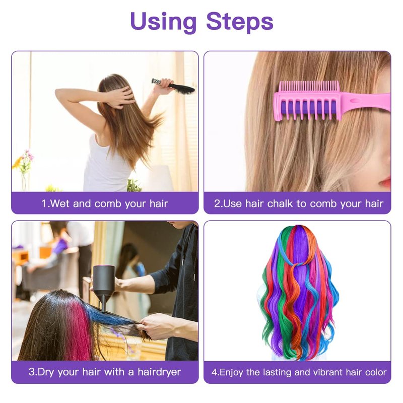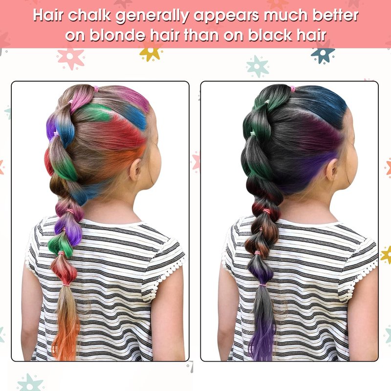 - 【Easy to Clean】The hair chalks are non-allergenic and water-soluble and environmentally friendly and can last up to 3 days; Colors can be cleaned simply by washing hair as normal with water and shampoo.